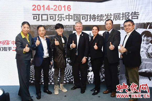可口可樂中國攜手合作伙伴發(fā)布2014-2016可持續(xù)發(fā)展報(bào)告(左起:可口可樂大中華及韓國區(qū)副總裁張華瑩、壹基金秘書長李勁、創(chuàng)作型歌手王嘯坤、可口可樂大中華及韓國區(qū)總裁馮廣晟、世界自然基金會全球淡水項(xiàng)目高級官員Judy Takas、世界自然基金會中國淡水項(xiàng)目總監(jiān)任文偉博士、可口可樂大中華及韓國區(qū)副總裁張建弢)