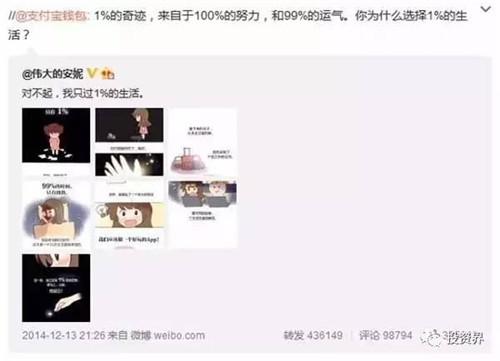 這條漫畫以陳安妮自己為主角,講述的是她在別人認為只有1%成功可能的情況下,堅持畫畫、創(chuàng)業(yè)、做APP的故事。漫畫推出隨即大熱,“姚晨轉了,趙麗穎也轉了”,在短時間內就達到了45萬轉發(fā),閱讀人數(shù)超過2億。