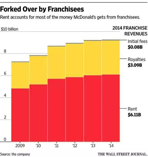 這是雷·克羅克在早期設計麥當勞的特許經(jīng)營模式時,就留下的一個獨到之處:為了加強控制權,所有門店所需要的土地物業(yè),都要由麥當勞總部出面收購,再轉(zhuǎn)租給特許經(jīng)營商,每年按略低于市場價的水平收購租金。在房地產(chǎn)市場節(jié)節(jié)攀升時,租金收入會水漲船高;而一旦特許經(jīng)營商表現(xiàn)欠佳,也可以隨時將他們“掃地出門”。一些持有麥當勞股票的對沖基金經(jīng)理們甚至曾經(jīng)想過,把麥當勞的餐飲和房地產(chǎn)業(yè)務拆分成兩部分,以便更有效地管理資產(chǎn)。