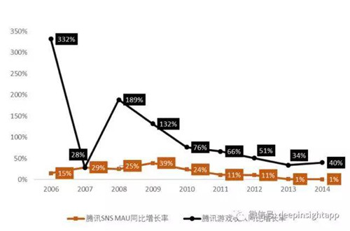 可以看到,騰訊SNS的MAU一直保持著一個(gè)較為穩(wěn)定的增長(zhǎng)率,而游戲收入增長(zhǎng)率的波動(dòng)相對(duì)較大,兩組數(shù)據(jù)并沒有出現(xiàn)很強(qiáng)的正相關(guān)。