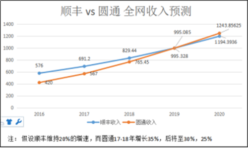 順豐全網(wǎng)收入份額一度達(dá)20%。但隨著增速落后逐年下滑,很可能要失去老大地位。圓通申通單票運(yùn)費(fèi)是順豐的1/2,只要件量是順豐的2倍。就有可能超過順豐。2016年2月圓通老板娘張小娟在杭州兩會(huì)上透露圓通2015年總件量約35億件(實(shí)際30億票),全網(wǎng)營收350億元(實(shí)際可能為300億元)。根據(jù)圓通發(fā)布的業(yè)績(jī)預(yù)告,2016年件量和收入都大于40%的增長(zhǎng)。全網(wǎng)收入可能超420億元。假若保持這種趨勢(shì)下去,圓通甚至中通、申通等都可能在接下來三五年內(nèi)在全網(wǎng)收入上超越順豐, 甚至比順豐提早突破千億大關(guān)。順豐可能掉至三四名甚至更后。