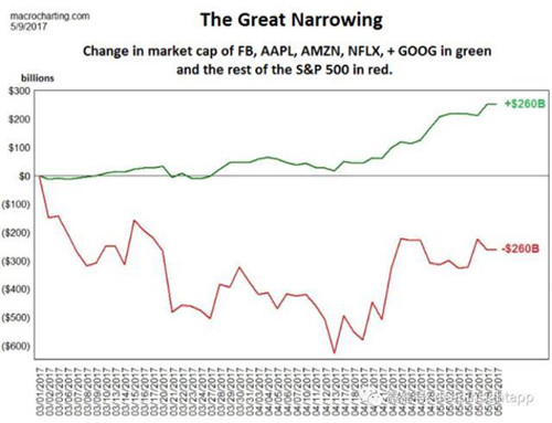 在美國(guó)同樣的事情也在發(fā)生:蘋果,微軟,亞馬遜,F(xiàn)acebook和谷歌這五只股票的漲幅占到今年標(biāo)普500的13%,以及納斯達(dá)克100的42%。下面這張圖非常有趣:從今年3月1日到5月9日,美國(guó)科技股的這五大天王市值增長(zhǎng)了2600億美元,而其他標(biāo)普500的公司市值縮小了2600億美元。