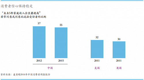 2015年調(diào)查數(shù)據(jù)顯示,55%的家庭認(rèn)為未來五年家庭收入將會(huì)顯著提高,而英國和美國在2011年時(shí)的數(shù)據(jù)僅為32%和30%。