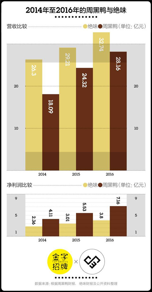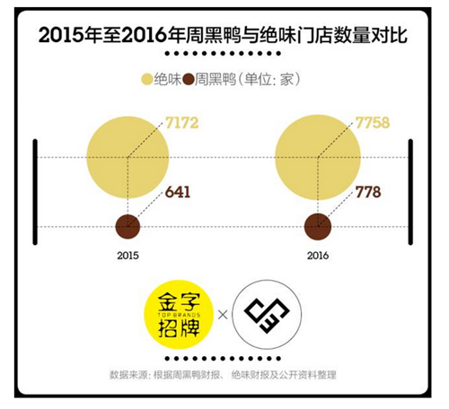 近兩年的市場表現(xiàn)沒有讓潘攀失望。根據(jù)咨詢公司弗諾斯特沙利文的數(shù)據(jù),中國休閑鹵制品零售總額從2010年的232億元增長至2016年的637億元,年均復(fù)合增長率為18.5%。截至2016年12月31日,周黑鴨全年營收約為28.16億元,較去年同期的24.32億元增長15.8%。雖然778家的門店數(shù)量只有絕味的1/10左右,但周黑鴨的利潤率是絕味的2倍多。