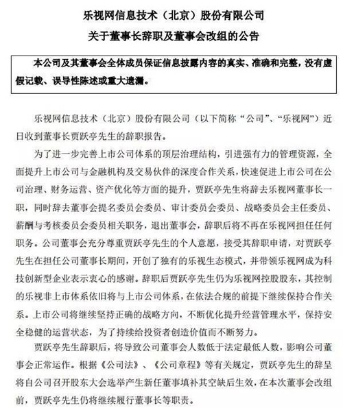 今天賈躍亭老師辭去樂視網(wǎng)董事長一職,同時辭去董事會提名委員會委員、審計委員會委員、戰(zhàn)略委員會主任委員、薪酬與考核委員會委員相關職務,退出董事會,辭職后將不再在樂視網(wǎng)擔任任何職務。