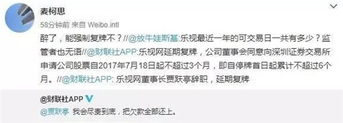 另外,關于樂視網(wǎng)股票復牌的事情,公告也一并做了回復:公司董事會同意向深圳證券交易所申請公司股票自2017年7月18日起不超過3個月,即自停牌首日起累計不超過6個月。