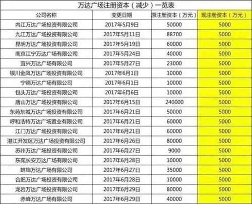 2017年5月9日至6月29日,全國19家萬達(dá)商業(yè)項目公司——各地的萬達(dá)廣場投資公司集中進(jìn)行了減資,注冊資本金由原先最高24億元,最低9000萬元,統(tǒng)一減至5000萬元。