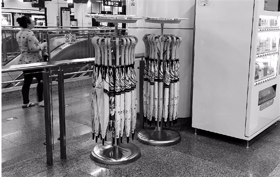 昨天,錢報記者來到地鐵武林廣場站,在地鐵刷卡入口處附近,就發(fā)現(xiàn)了兩個圓柱形的架子。架子上掛滿了各式各樣的長柄雨傘。架子上貼著提示語:掃碼借傘。