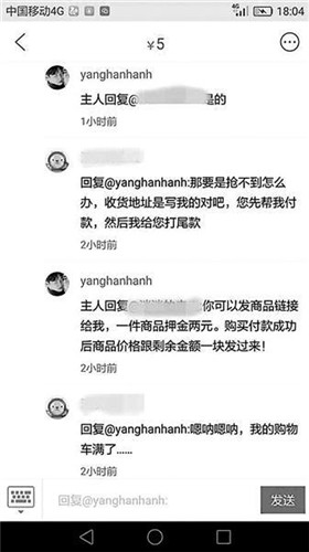“你到時(shí)候把商品的鏈接給我,然后就是你的收貨地址,每件商品你要給我2塊錢的押金,到了11號(hào)那天,我來(lái)幫你搶東西,然后付款,沒(méi)搶到的話我會(huì)退押金,搶到的東西會(huì)直接由賣家郵給你,我把交易成功的截圖發(fā)給你之后,你給我付尾款就行了?!边@位出租“購(gòu)物車車位”的商家說(shuō),之所以每件商品需要支付2元的押金,是為了防止違約。