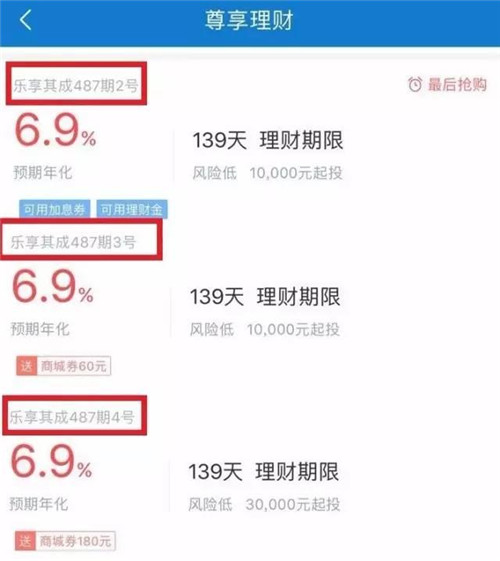 樂視金融APP上在售的樂享其成系列產(chǎn)品顯示,其中487期2號(hào)、3號(hào)和4號(hào)產(chǎn)品的投資期限完全相同,收益率也同為6.9%,并且都是7月7日起計(jì)算利息,只是2號(hào)和3號(hào)產(chǎn)品的理財(cái)起點(diǎn)起1萬元,4號(hào)產(chǎn)品的理財(cái)起點(diǎn)為3萬元。