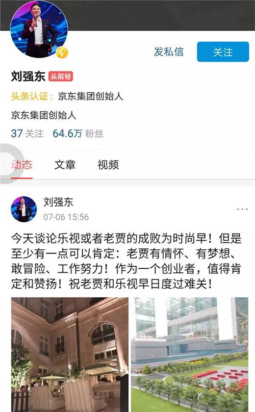 京東集團(tuán)創(chuàng)始人劉強(qiáng)東在個(gè)人認(rèn)證頭條號(hào)對(duì)樂視表示聲援,劉強(qiáng)東稱:今天談?wù)摌芬暬蛘呃腺Z的成敗為時(shí)尚早!但是至少有一點(diǎn)可以肯定:老賈有情懷、有夢(mèng)想、敢冒險(xiǎn)、工作努力!作為一個(gè)創(chuàng)業(yè)者,值得肯定和贊揚(yáng)!祝老賈和樂視早日渡過難關(guān)!