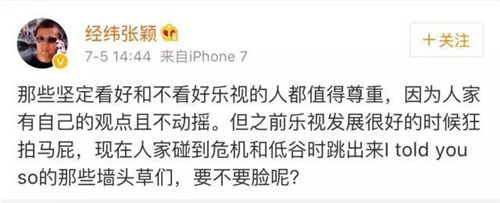 那些堅(jiān)定看好和不看好樂視的人都值得尊重,因?yàn)槿思矣凶约旱挠^點(diǎn)且不動(dòng)搖。但之前樂視發(fā)展很好的時(shí)候狂拍馬屁,現(xiàn)在人家碰到危機(jī)和低谷時(shí)跳出來I told you so的那些墻頭草們,要不要臉呢?