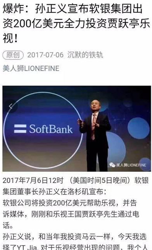 凡是相信“孫正義投資樂視200億美元”的人智商都需要充值。第一,軟銀自己因?yàn)榫拶Y收購ARM資金鏈都很緊,哪來這么多現(xiàn)金?第二,這個(gè)世界上沒任何互聯(lián)網(wǎng)公司能拿到單筆超過50億美元的投資。第三,文章那么多驚嘆號(hào)……孫正義表示這個(gè)鍋我不背!一看就是個(gè)憤憤蹭熱點(diǎn)的,不值得為這種垃圾信息浪費(fèi)時(shí)間