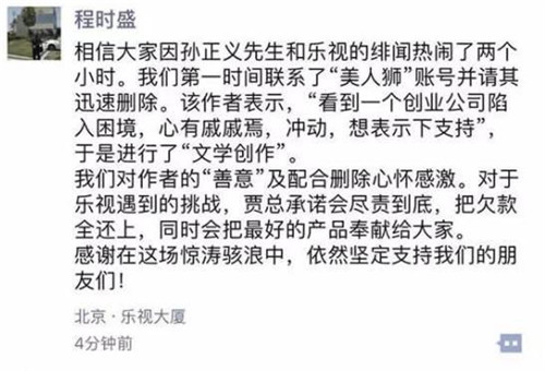 程時(shí)盛在朋友圈中寫到:相信大家因?qū)O正義先生和樂視的緋聞熱鬧了兩個(gè)小時(shí)。我們第一時(shí)間聯(lián)系了“美人獅”賬號(hào)并請(qǐng)其迅速刪除。該作者表示,“看到一個(gè)創(chuàng)業(yè)公司陷入困境,心有戚戚焉,沖動(dòng),想表示下支持”,于是進(jìn)行了“文學(xué)創(chuàng)作”。我們對(duì)作者的“善意”及配合刪除心懷感激。對(duì)于樂視遇到的挑戰(zhàn),賈總承諾會(huì)盡責(zé)到底,把欠款全還上,同時(shí)會(huì)把最好的產(chǎn)品奉獻(xiàn)給大家。感謝在這場(chǎng)驚濤駭浪中,依然堅(jiān)定支持我們的朋友們!
