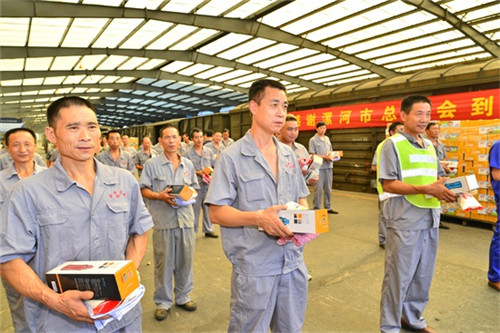 7月24日上午,烈日當(dāng)頭,漯河市總工會黨組書記、常務(wù)副主席吳花蕾,市總工會副主席張煒一行在雙匯集團工會主席劉清德陪同下來到雙匯儲運公司慰問一線員工,為他們送去了飲水杯、毛巾、白糖、葡萄糖飲料等防暑用品,炎炎夏日里給廣大員工送去絲絲清涼。