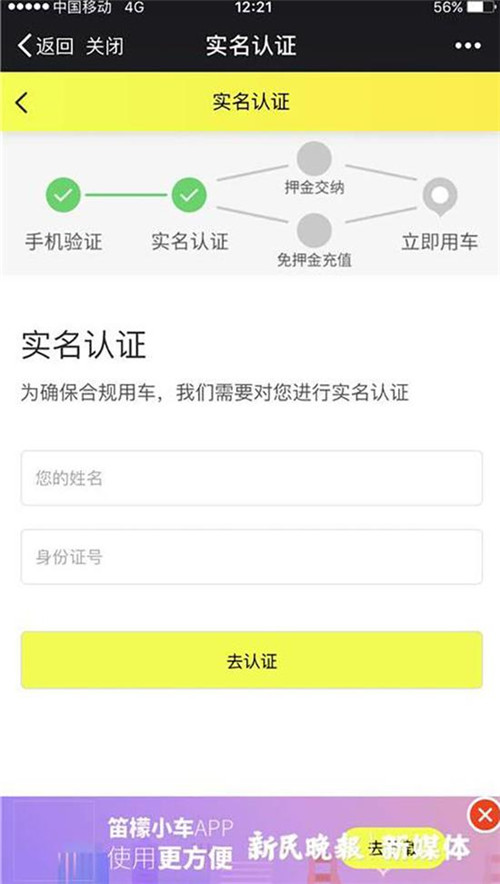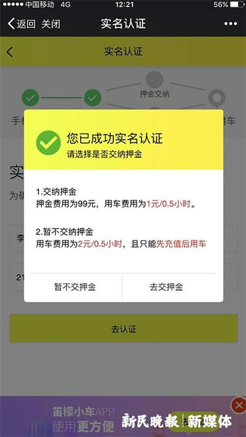 這輛黃色小車車身上貼有二維碼,并寫著“掃碼一元用車”,右側(cè)后輪安裝有四位密碼鎖。小新嘗試掃碼,跟共享單車注冊(cè)流程相似,需要手機(jī)注冊(cè)和實(shí)名認(rèn)證。實(shí)名認(rèn)證后,則可選擇是否交納押金,按提示說明,兩者在后續(xù)使用費(fèi)用上存在差異,交納99元押金后的使用價(jià)格便宜一些,半小時(shí)1元。