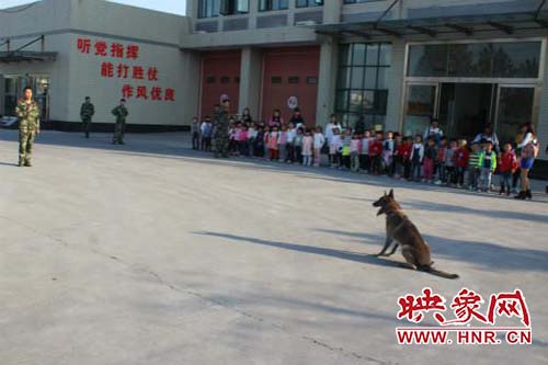 在老師和消防隊(duì)員的帶領(lǐng)下,孩子們有秩序地參觀。首先參觀了一樓車(chē)庫(kù),孩子們被消防車(chē)以及車(chē)上的先進(jìn)裝備深深吸引,消防員叔叔耐心細(xì)致地為孩子們講解消防車(chē)上的小秘密:高壓水槍、防毒面罩、氧氣瓶、急救箱、云梯、泡沫噴射槍、定位器、呼救器等消防裝備,使孩子們開(kāi)了眼界。消防隊(duì)員還用淺顯的語(yǔ)言向孩子們介紹了消防常識(shí):火災(zāi)的危害、火災(zāi)的預(yù)防、火災(zāi)發(fā)生時(shí)的逃生自救、消防器械的使用、消防服的穿戴等等。接著孩子們參觀了二樓的消防員宿舍、圖書(shū)室、會(huì)議室、體育活動(dòng)室等,更深入地了解了消防員的學(xué)習(xí)生活,更加走近消防員。最后,消防員為孩子們帶來(lái)了精彩的警犬搜救表演,孩子們興高采烈,不約而同為消防員叔叔鼓掌叫好!