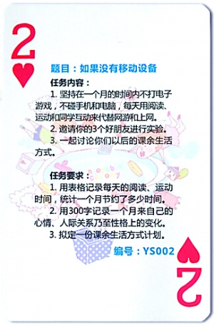 趙伊湄抽到了“紅桃2”。作業(yè)題目是:如果沒有移動設(shè)備,同時給出了三項任務(wù),要求在一個月內(nèi)不打電子游戲,不碰手機和電腦,每天用閱讀、運動和同學(xué)互動代替網(wǎng)游和上網(wǎng)。