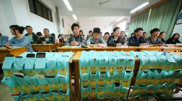 此前已經(jīng)有一些大學課堂施行“課前上交手機”,圖為洛陽理工學院的學生課前上交手機,每個手機一個“機位”。