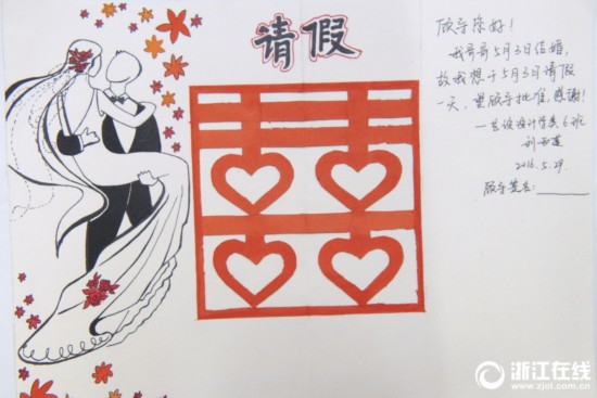 9月19日,在浙江理工大學(xué)藝術(shù)與設(shè)計學(xué)院,老師顧紅建正在展示學(xué)生們交上來的請假條。這些請假條風(fēng)格多變,充滿創(chuàng)意,有簡筆畫風(fēng)格的,也有抽象的。比如有學(xué)生畫了一班開走的列車和一個追趕的小人兒,表示趕不上末班車而遲到;有的把假條做成了賀卡,折頁打開一個大紅喜字,畫上浪漫的婚禮現(xiàn)場,用中英文寫上請假“文案”,原來是參加姐姐的婚禮。顧老師說,讓學(xué)生制作手繪假條,希望學(xué)生們學(xué)會在生活中用藝術(shù)語言敘事,同時也想幫學(xué)生們留下大學(xué)生活的回憶。(浙江在線記者 楊曉軒 李翔 于詩奇 攝)