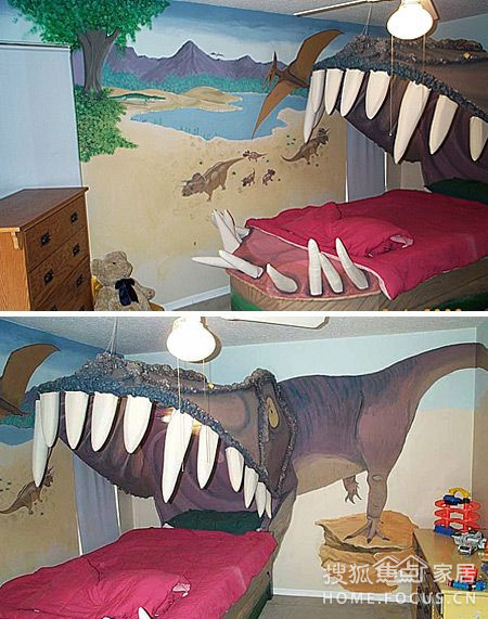 這是一個(gè)自帶3D效果的臥室床頭背景墻,從正面看還以為只是一只大恐龍。從側(cè)面我們看到的卻是一個(gè)突出的恐龍嘴。不知道躺在這樣的床上是怎樣的感覺。
