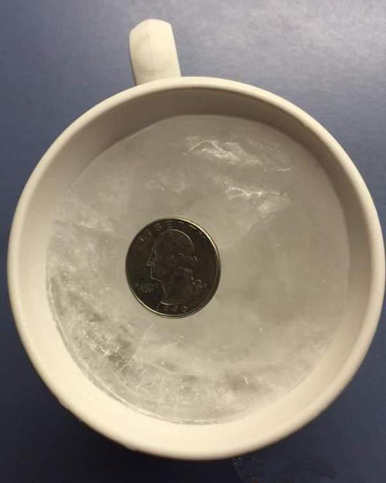 這時(shí)候只要在冷凍庫中放入一個(gè)「結(jié)冰的水杯」并在「水杯上放一枚硬幣」即可!