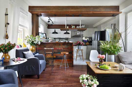 雖然是小戶型,綠植的面積絲毫不含糊,屋里屋外都擺著大件的綠色盆栽;花束則插在更有設計感的瓶罐中。和睫毛聊起了為愛布置花房的蓋茨比,雖然不如他闊綽,也真像把花園搬進了家里。