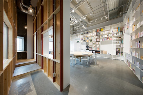 這個建筑工作室通過創(chuàng)建一個既包括圖書館,另外還有一個蛋糕店的空間來完成人們輕松聚集在一起這個愿望??此坪敛幌嚓P(guān)的兩個空間,只要提供了一個聚集區(qū),就形成了一個互動,兩者就聯(lián)系在了一起。