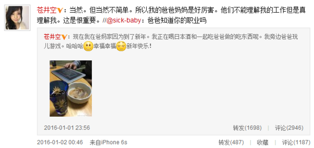 隨后有網友留言,問及“你爸爸知道你職業(yè)嗎?”蒼井空很是坦誠回答:“當然。但當然不簡單。所以我的爸爸媽媽是好厲害。他們不能理解我的工作但是真理解我。這是很重要?!备芯W友敏感地問道:“蒼老師的父親也看過她的作品嗎?”蒼井空反問“如果你爸爸的話怎么樣”讓網友為其機智點贊。