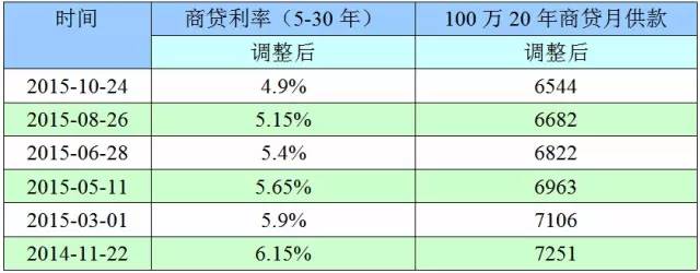 以去年最后的利息調(diào)整日期(2014年11月22日)計算,你2016年負(fù)擔(dān)的利率一下子從2015年的6.15%下降到4.9%。今年央行利率5連降,100萬20年商業(yè)貸款的月供每次約減少150元左右。明年的月供款從7251元下降至6544元,每月節(jié)省707元!