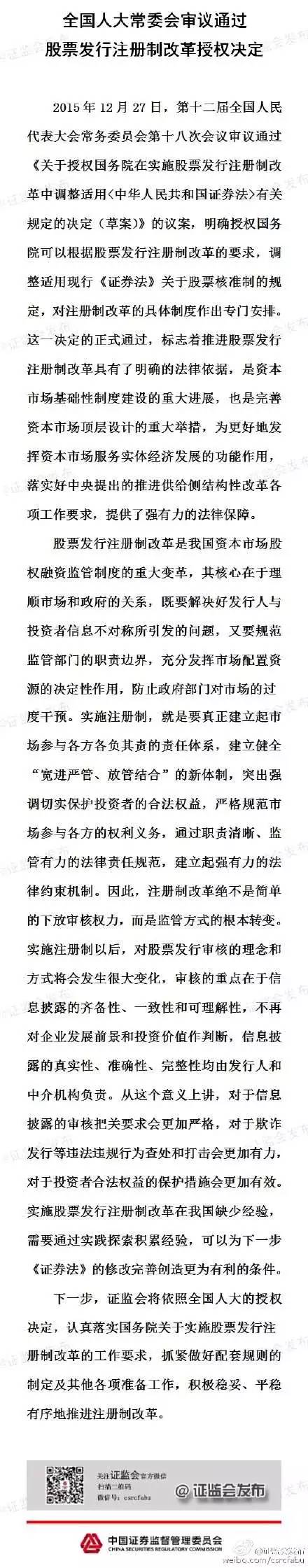 證監(jiān)會(huì)官方微博27日傍晚發(fā)布信息,稱全國(guó)人大常委會(huì)審議通過(guò)股票發(fā)行注冊(cè)制改革授權(quán)決定,下一步,證監(jiān)會(huì)將積極穩(wěn)妥、平穩(wěn)有序地推進(jìn)注冊(cè)制改革。