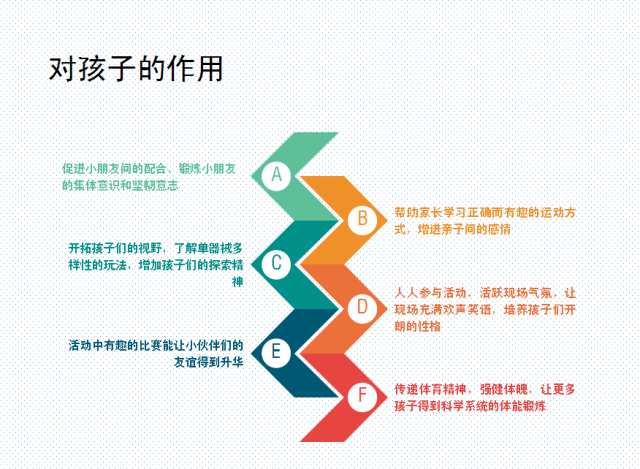 “趣味親子運動趴”根據(jù)孩子年齡不同設置指標,由家長和孩子共同參與、相互協(xié)作完成,是一次從耐力到動手能力、反應力到創(chuàng)造力,速度與平衡全面考量的一系列親子活動,從“歡樂親子跑”到“趣味體能大沖關”,不但提高幼兒的活動技能,開拓孩子們的視野,增加孩子們的探索精神,增強少年兒童的身體素質(zhì)的,又寓教于樂,有利于孩子們身心健康成長,同時讓家長們也了解正確而有趣的運動方式,更好的增進父母與孩子間感情。