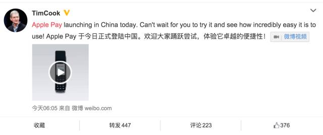 今天早上6點(diǎn)05分,蘋(píng)果ceo timcook發(fā)了一條微博宣告Apple Pay正式入華!