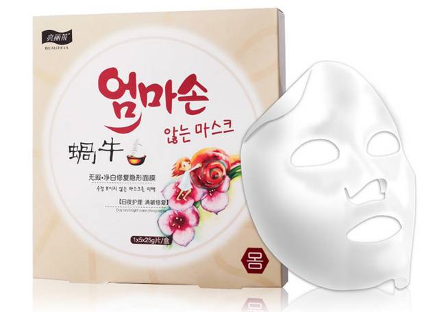 標(biāo)稱(chēng)廣州市尚氏化妝品有限公司、廣州市強(qiáng)邦化妝品有限公司聯(lián)合出品的亮麗萊蝸牛無(wú)暇凈白修復(fù)隱形面膜。