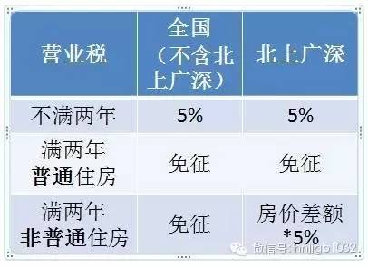 但“北上廣深”四個(gè)一線城市暫不實(shí)施,也就是說,北上廣深在營業(yè)稅政策方面仍實(shí)行財(cái)稅〔2015〕39號(hào)文,即個(gè)人購買不足2年的住房對(duì)外銷售的,全額征收營業(yè)稅;個(gè)人購買2年以上(含2年)的非普通住房對(duì)外銷售的,按照其銷售收入減去購買房屋的價(jià)款后的差額征收營業(yè)稅;個(gè)人購買2年以上(含2年)的普通住房對(duì)外銷售的,免征營業(yè)稅。