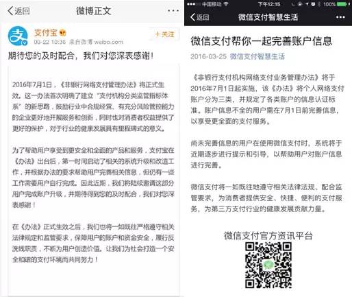 22日,支付寶官方微博發(fā)表聲明稱,“支付寶將在《辦法》出臺后正式啟動相關(guān)系統(tǒng)升級與改造工作,并且?guī)椭脩暨M(jìn)行相關(guān)操作。”25日中午,微信支付在其官方賬號“微信支付智慧生活”發(fā)布了題為《微信支付幫你一起完善賬戶信息》的短文。