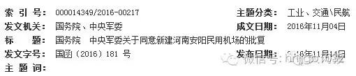 國務(wù)院 中央軍委關(guān)于同意新建河南安陽民用機(jī)場(chǎng)的批復(fù)