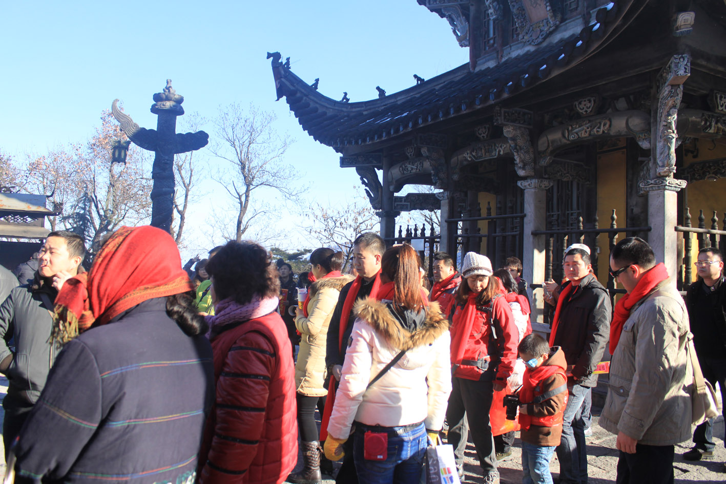 我們的自駕車隊(duì)12月31號抵達(dá)九華山之前,這里剛剛下過一場雪,湛藍(lán)色的天空、漫山遍野銀裝素裹,明黃色的寺廟在白雪的映襯下別有一番景致。在第一天登百歲宮時(shí),大家相互鼓勵,并不時(shí)調(diào)侃氣氛,讓不少車友第一次感受到了雪中登山的樂趣。