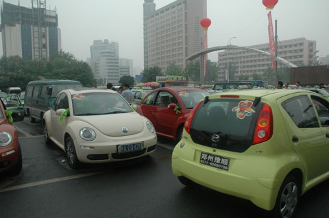 啟動(dòng)儀式現(xiàn)場(chǎng),愛(ài)心送考車輛整齊的貼上了愛(ài)心送考車貼,后視鏡上扎上了綠絲帶