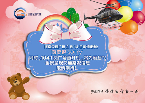 2月14日當(dāng)天,1041交廣號(hào)直升機(jī)也將再次為愛起飛,在全景呈現(xiàn)路況信息的同時(shí),為您提供情人節(jié)私人定制飛行。如果你足夠幸運(yùn),將有機(jī)會(huì)坐上1041交廣號(hào)直升機(jī),和你的那個(gè)Ta獨(dú)享二人世界,遨游藍(lán)天、一起俯瞰鄭州美景。