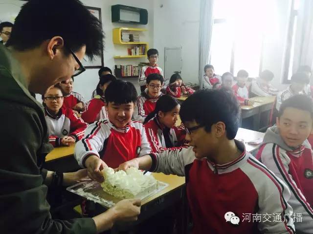班主任李少鋒老師很激動(dòng),他說,沒想到一條小小的微信,竟然真的請(qǐng)到了河南交通廣播主持人來(lái)給同學(xué)們送蛋糕,他說,這樣的班會(huì)開得很有意義,讓孩子們學(xué)會(huì)分享,是與同學(xué)們心貼心的交流。