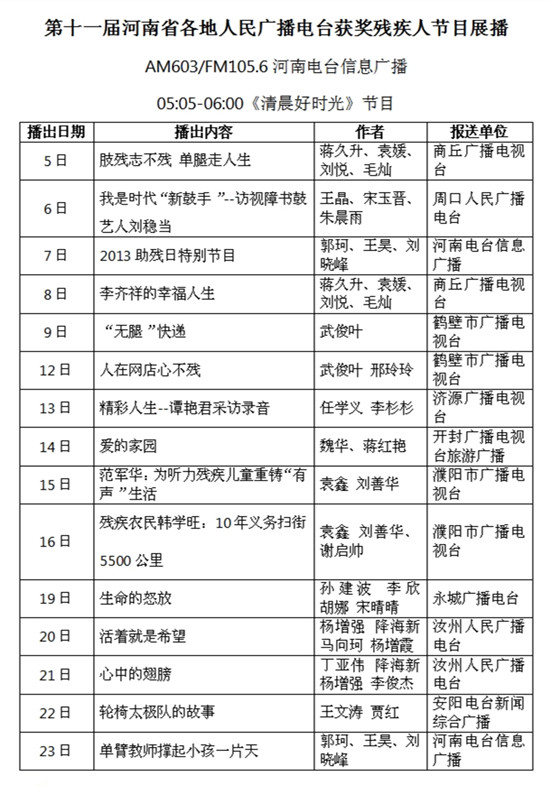 自2014年5月5日起,河南省“第十一屆各地人民廣播電臺殘疾人節(jié)目展播”活動中評選出的優(yōu)秀廣播節(jié)目將在AM603、FM105.6河南人民廣播電臺信息廣播《清晨好時(shí)光》節(jié)目中陸續(xù)播出。
