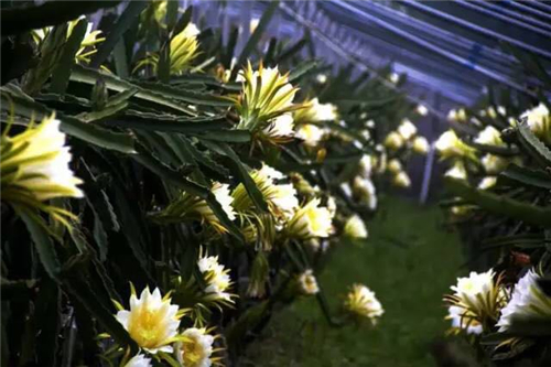 金田地大棚火龍果晚上八九點開始開花,持續(xù)到第二天早上九十點鐘閉合。
