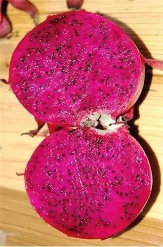 紅心火龍果是火龍果中的稀有品種,在市面上并不常見。它富含花青素,甜度遠高于普通白心火龍果。金田地園區(qū)的火龍果引自我國臺灣紅水晶品種,整個果的甜度都非常均衡,連近皮部也甜。它的甜度不一定最高,但它的口感數(shù)一數(shù)二。