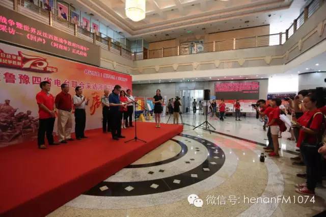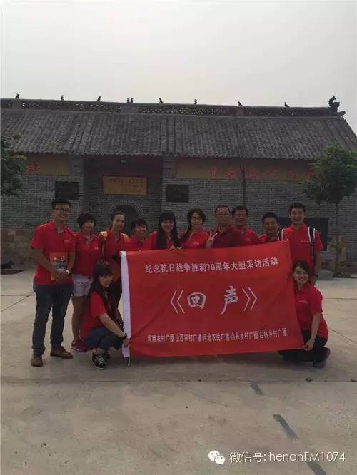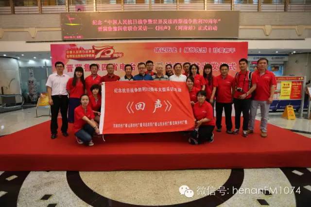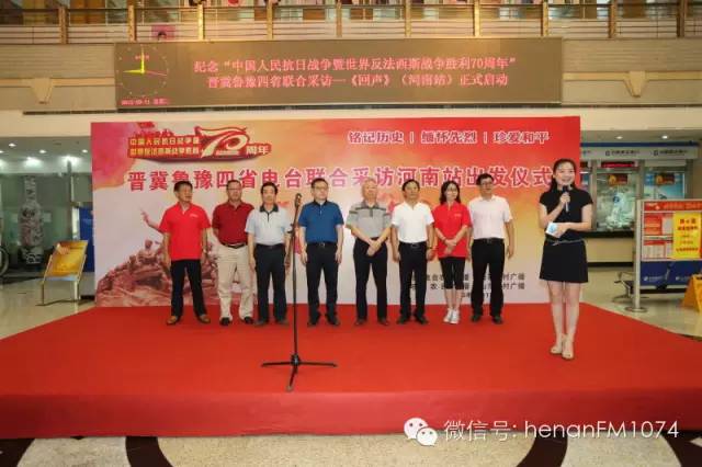 8月11日上午九點(diǎn),由河南農(nóng)村廣播、山西農(nóng)村廣播、河北農(nóng)民廣播、山東鄉(xiāng)村廣播于2015年7月至9月展開“追隨先輩足跡,唱響時(shí)代凱歌”——紀(jì)念抗日戰(zhàn)爭(zhēng)暨世界反法西斯戰(zhàn)爭(zhēng)勝利70周年晉冀魯豫記者大型聯(lián)合采訪活動(dòng)《回聲》在河南人民廣播電臺(tái)啟動(dòng)。