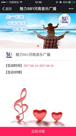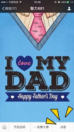 本周日就是父親節(jié)了。平時向爸爸們表達情意的機會可能不多,趁著節(jié)日,你可別落下。特意給親愛的老爸準備了一份禮物,6月14日——6月16日,點擊菜單欄中的“點歌”或直接點擊本文底部的閱讀原文,進入點歌互動頁后點擊“立即點歌”,填寫并提交姓名、手機號、所點歌曲名稱、以及你想對父親說的話。