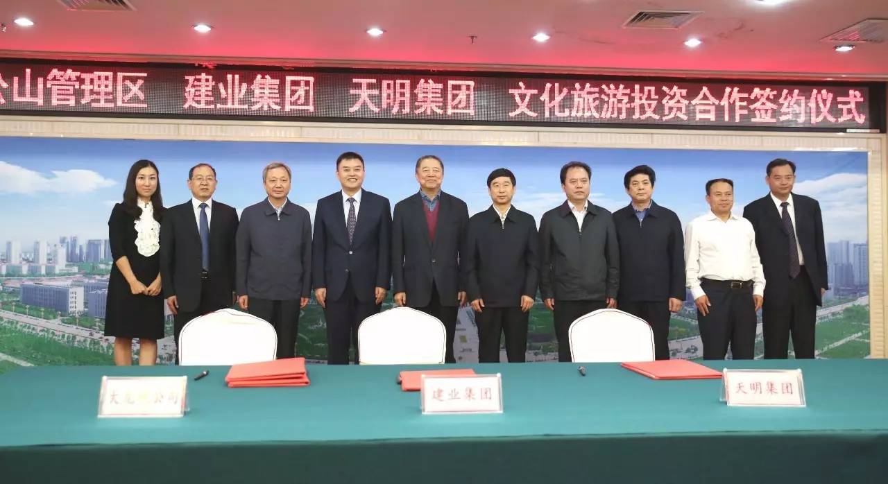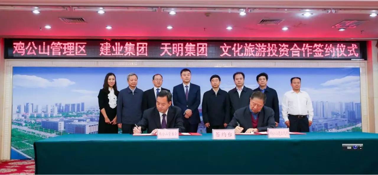 2017年9月2日上午,雞公山管理區(qū)與建業(yè)集團(tuán)、天明集團(tuán)在信陽(yáng)市舉行文化旅游投資會(huì)暨簽約儀式。此次簽約項(xiàng)目總面積287平方公里,初步構(gòu)思“一園十三景”,計(jì)劃總投資300~500億元。未來(lái),兩家企業(yè)將攜手打造文化旅游項(xiàng)目,助力信陽(yáng)雞公山脫貧攻堅(jiān)、建設(shè)美麗鄉(xiāng)村。信陽(yáng)市市委書記喬新江、市長(zhǎng)尚朝陽(yáng)、建業(yè)集團(tuán)董事長(zhǎng)胡葆森、建業(yè)集團(tuán)聯(lián)席董事長(zhǎng)劉衛(wèi)星、建業(yè)集團(tuán)副總裁陳劍、天明集團(tuán)董事長(zhǎng)姜明、天明城建集團(tuán)總裁郭穎、雞公山管委會(huì)黨委書記、主任趙安虎等領(lǐng)導(dǎo)出席簽約儀式。