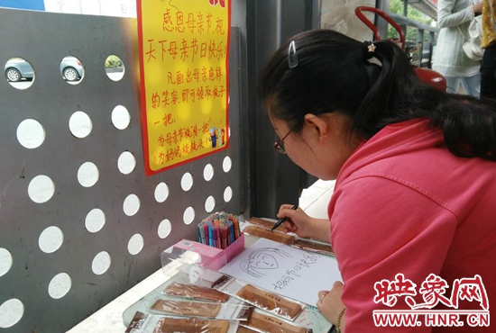 映象網(wǎng)快訊(記者 何葉 文/圖)昨天(5月14日)是母親節(jié),在金水路快速公交站臺內(nèi),別樣的慶祝母親節(jié)活動正在進行著,凡是在站臺內(nèi)畫出母親慈祥笑容的乘客,都能獲得梳子一把,為辛勞的母親梳梳頭。