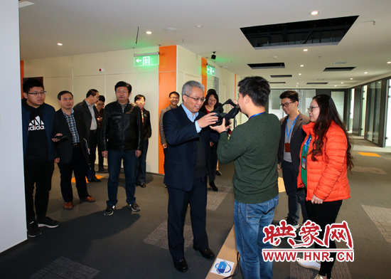 在映象網(wǎng)VR體驗(yàn)區(qū),易滌非一行還饒有興致的戴上VR眼鏡,親身體驗(yàn)了由映象網(wǎng)和河南城市VRAR研究院合作開發(fā)的HVR互動(dòng)體驗(yàn)系統(tǒng),并對映象網(wǎng)的這一場景式互動(dòng)創(chuàng)新體驗(yàn)給予肯定。
