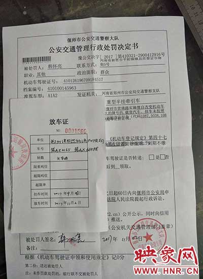 11月2日下午16時許,偃師市交警大隊(duì)給韓先生開具了公安交通管理行政處罰決定書【2017】410321-2900412916號,處罰900元。韓先生急匆匆去交了900元罰款后,拿了交警隊(duì)的交款單去了交通局,交通局于當(dāng)天晚上17時30分許,給韓開具放車單。韓去停車場看到自己的車時,已經(jīng)是當(dāng)天晚上20時以后了。
